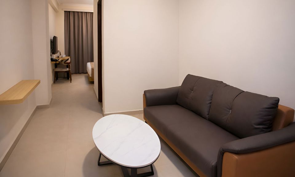 Our Superior Rooms, measuring 27.8 sq mt, offer the utmost comfort and convenience. It features a separate bedroom and living space, a king-size bed, a personalized bathroom with a bathtub and shower, a desk area, and tea and coffee making facilities with a kettle, including Android TVs with DVD players, high-speed internet, and Wi-Fi connectivity